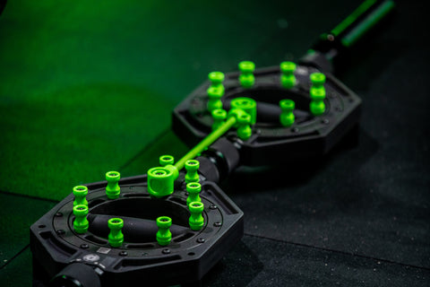 The green pivot pins are purposely designed out of a high durometer plastic that dynamically rotates with the elastic bands as they stretch.  Using plastic instead of steel limits the natural degradation that all resistance bands develop over time.